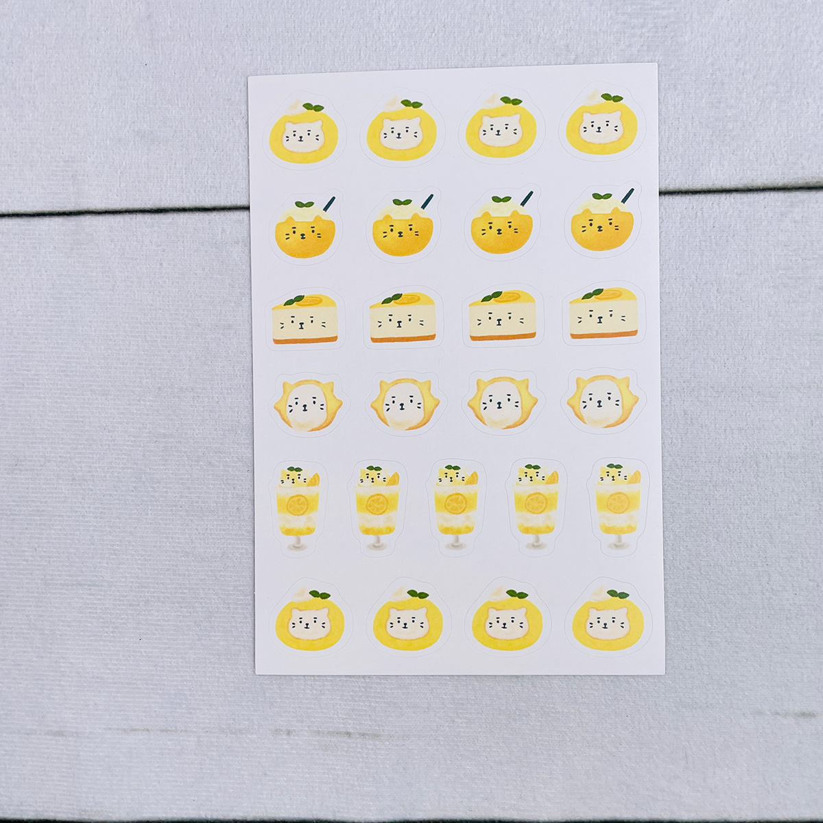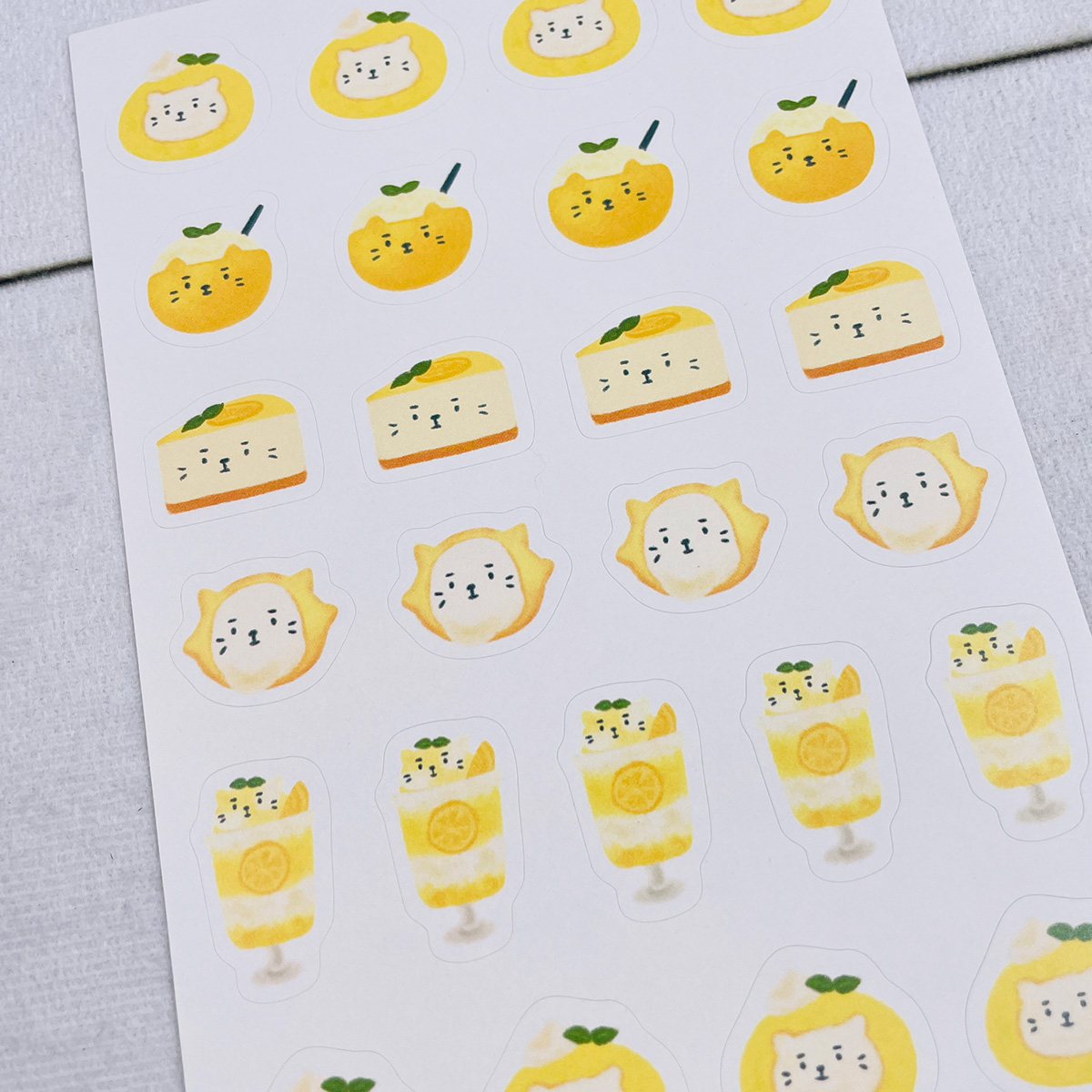イラストレーターAOYOSHIさんデザインのかわいいシール。いろいろなレモンスイーツになった猫たちがとってもかわいい。